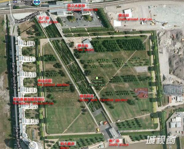 公园成功地打造了与城市背景间的强烈关系,塑造出一个与周边场地整体范围相融合的公园。由于公园的用地是化工厂、染料厂和军工厂的遗址,建设中被置换的顶层土与被污染的下层土必须隔离,因而公园的建设就如同在屋顶建造花园。公园的平面是几何形的,用地接近方形,两条轴线呈对角线方向立体相交穿过整个公园。其中一条是利用原有低地设计的250m长、28m宽的条状下沉式广场和花园,被称为“绿色船坞”,试图唤起人们对这个地区历史的回忆。起点是连接道路的一个旱喷泉广场,在这里,人的视线可以顺着直线的“船坞”一直延伸到远处的泰晤士河和闪亮的盔状水闸构筑物。
