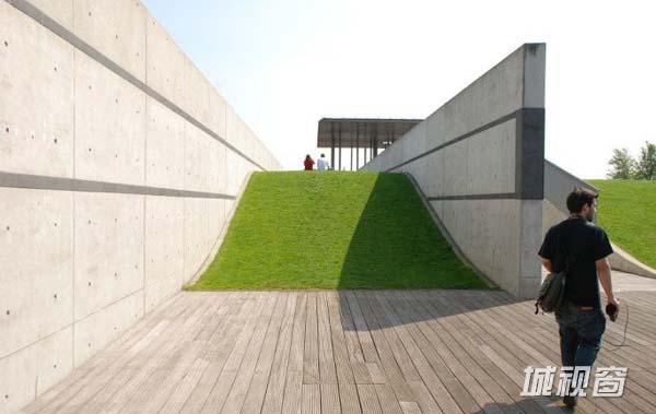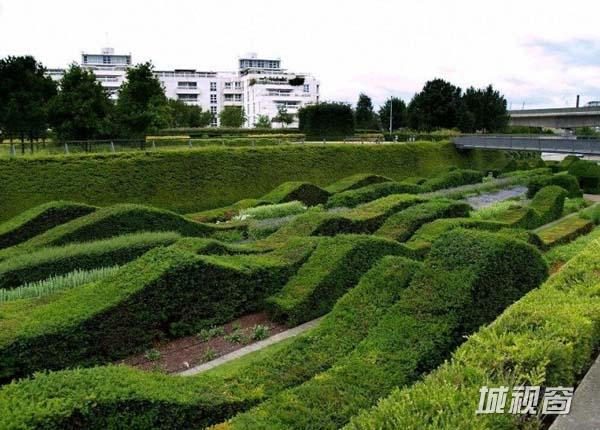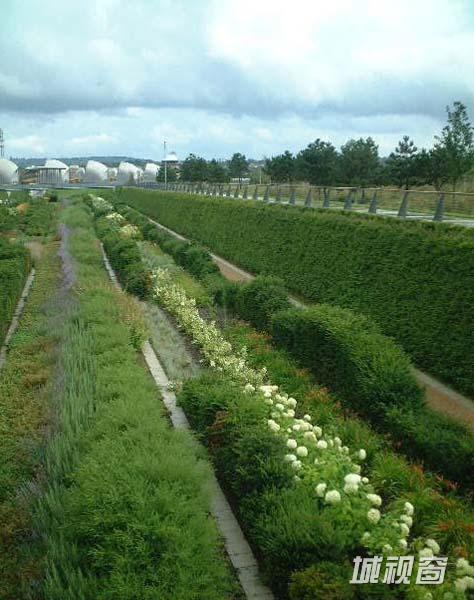 另外一条对角线跨越了“绿色船坞”,把未来的综合开发区域和滨水区连接了起来。公园的大部分是规则种植的白桦树丛和野花草甸与草坪交织的条带。种植的方式是人工的,展现的景观却非常自然。公园南边是滨河散步道,山毛榉树丛形成的茂盛的植物花园环绕在公园的另外三边。如同许多法国园林一样,这里严格的几何秩序系统强调了视线并加强了人的空间体验。当人们置身于高大、连绵、起伏的绿篱中,穿行于绿色波浪与海洋中,嗅着清香的自然味道,无论是孩童、老人都能找到亲近自然的喜悦与舒心,孩子可以在此欢快奔跑,戏嬉玩耍;老人可以缓步慢行、悠闲自得,这里为所有的人提供了一个轻松、宁静而生态的自由空间。