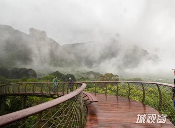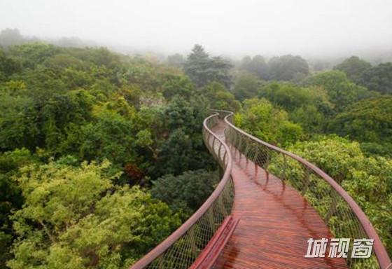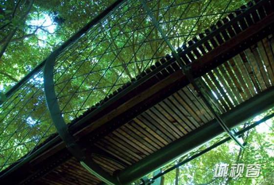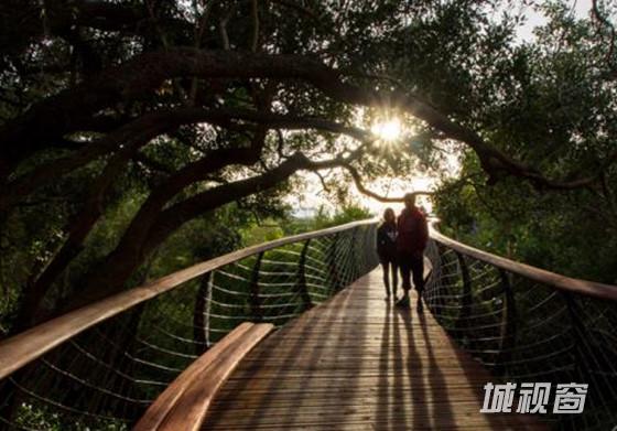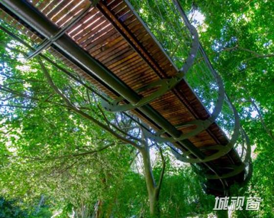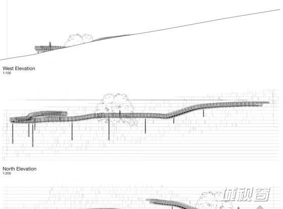 Cape Town事务所的两位设计师完成了一个蜿蜒的木质走道,从树冠之中穿梭而过。这个步道叫做“树蛇”,沿着场地起伏的地形设计。设计师Thomas介绍说:“这个概念来自于场地地形,当地形不是平稳时,蛇会开始在树木间穿梭。”从起点开始,步道逐渐升高,高度上能到达12米的树顶。总共有十根金属管,支持上面分散的金属构筑物。柱子的位置和步道方向都致力于最小化对森林系统的破坏。柱子上方的圆管组成了步行道弧线形的脊梁。设计师Fagn说:“我们创造的是构筑物,要尽量限制对树林的破坏。”甲板由来自非洲西部的循环种植木板条组成在两个地方的步道特别宽,并且高于树冠,设置了木质座椅和扶手。