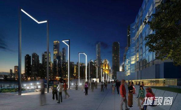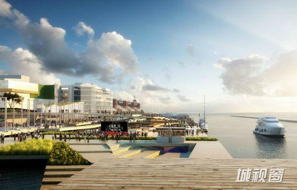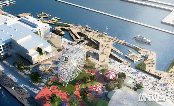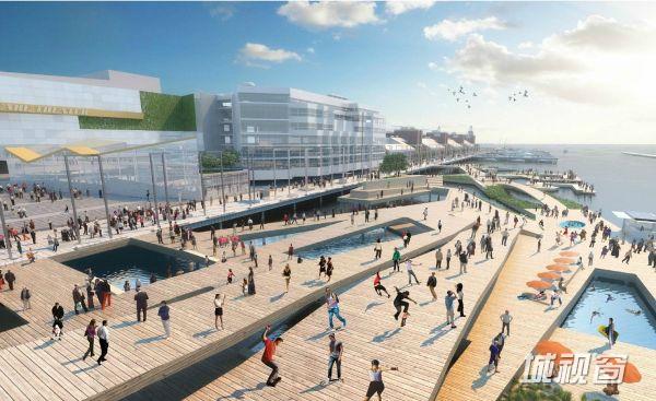 一部宽敞的楼梯将人们引往码头公园。这里混合了骑行空间、剧院、室外空间以及其他更多的空间,形成了一个重点关注互动游戏的区域。水晶花园中一种新创的地形创造了一个室外空间乐园,可以举办“娱乐艺术展览”。