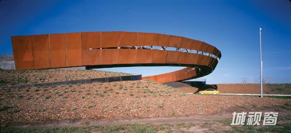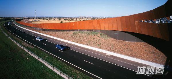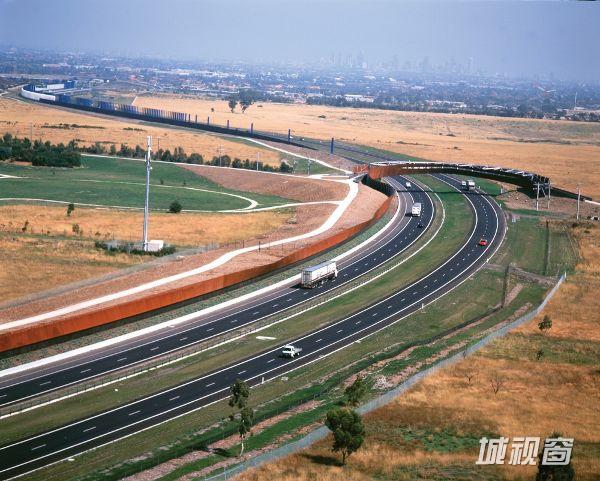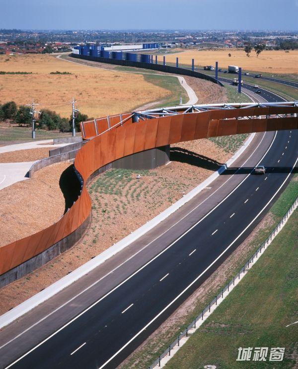 新人行桥为本项目的一个主要元素,它成为通向从地平线上远眺得到的遥远的墨尔本市的门户。这座桥的平立面设计均为复杂的曲线形式,为钢管桁架结构,表面同样采用了奥氏体钢材,作为主要的隔音墙材料,不过在这里墙体似乎越过了路面,展示了一种欢迎或挥别的姿态。