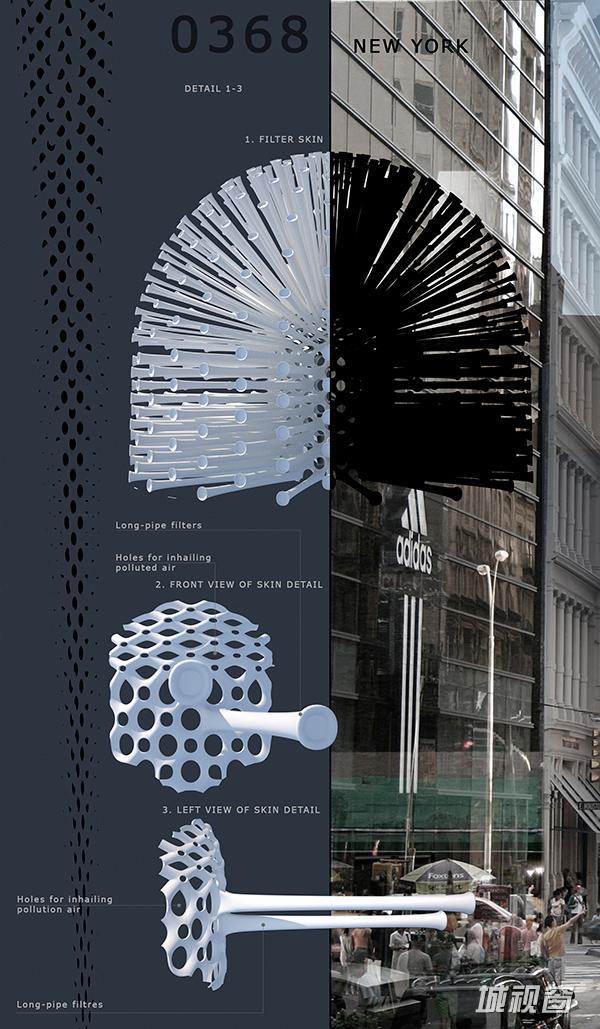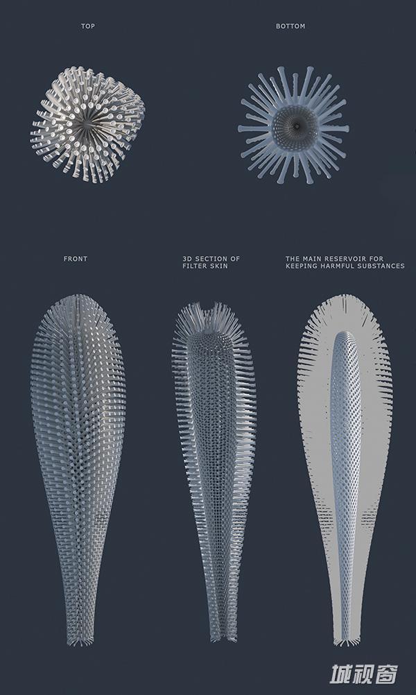 Umarov Alexey认为,高楼大厦除了用来居住以外,它应该还可以做别的事情。Hyper Filter 上密密麻麻的管状物其实是一种过滤器,可以收集空气中的污染物,留待进一步的处理。且不提 Hyper Filter 的实用性如何,它的设计确实充分体现了设计师强大的想象力。