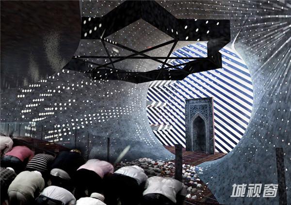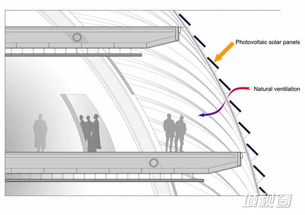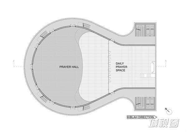 教育、社交、管理和商业区域与祈祷空间相分离。建筑立面采用“双层表皮” – 围绕祷告厅创造了一个圆形空间。建筑立面上安装了一系列百叶窗,还覆盖了一层轻薄的太阳能光电板,为清真寺和其它设施提供电能。