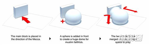 建筑师将清真寺的两大元素 – “穆斯林朝觐墙”和“大穹顶” 结合到一起 – 建筑平面为参拜者指示出了祈祷的方向,为人们创造了一个集会的公共空间。从一个几何视点来看, 这座面朝麦加圣城的清真寺,好像一个从墙壁种凸出的球体。