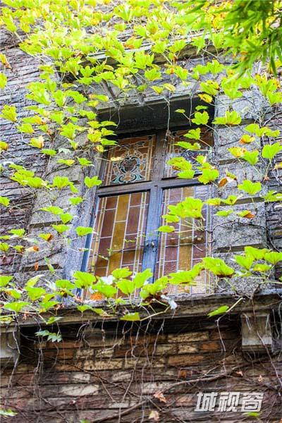 黄色糙面水泥沙墙面,楼前有小庭院。楼面的部分山墙露出暗红的木结构,坡顶上有高高的烟囱;侧门入口处有拱券形的雨棚伴着高耸入云的水杉树,同样的静寂幽雅,美丽如画。