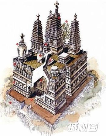 画北京香山碧云寺金刚宝座塔也得到同样的感受,高台上共有八座高低不等石塔,人行空间所剩无几,我为了画鸟瞰剖视图,穿梭于八塔之间,东张西望描绘,犹如周旋于八尊佛像之中。