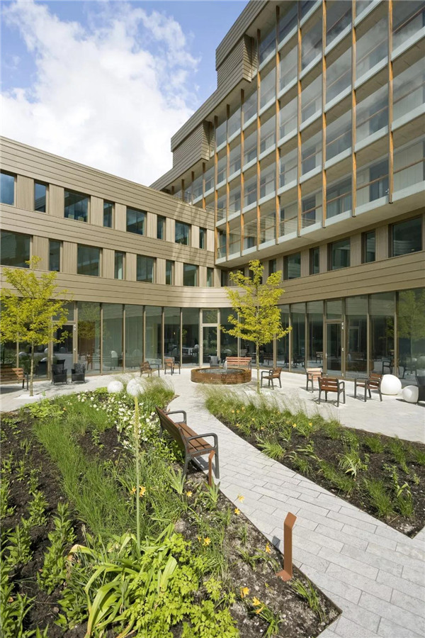 底层布局灵活,内部空间通过大型玻璃幕墙延伸到园景花园。