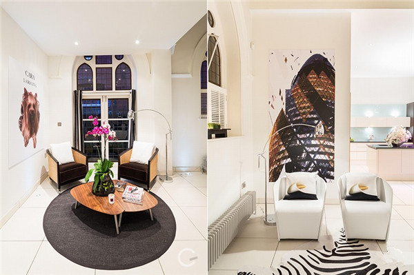 改造过程保留了教堂的主要特征和原有结构构件,将内部刷成以白色为主的基调。教堂曾有的高挑空间和大大的拱形窗为室内带来了很好的光照。其中的拱形窗本身具有很好的装饰性。除此之外,内部空间使用了许多大面纯净玻璃作为隔断,视线非常通透。