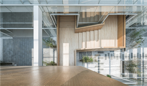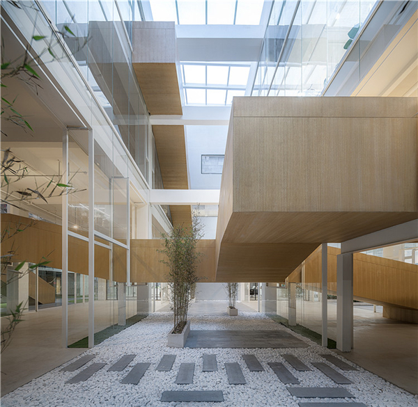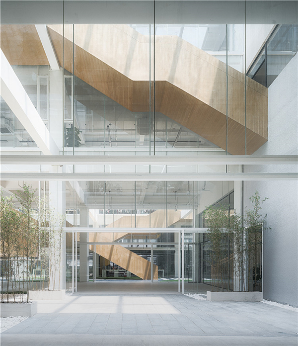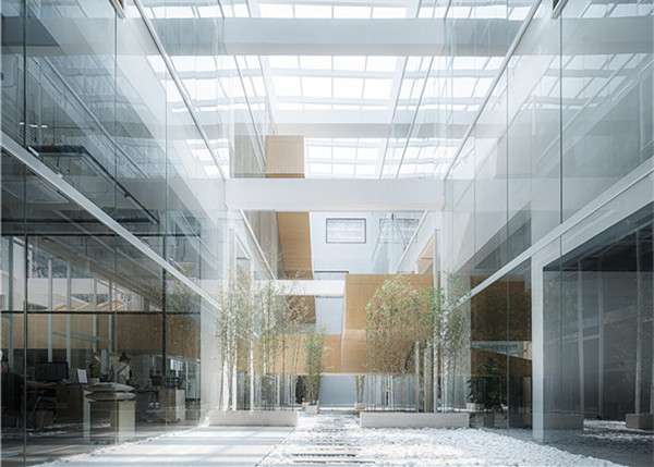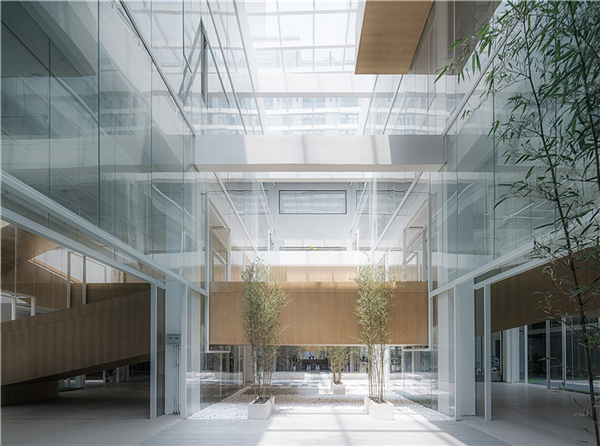 三个中庭的出现,尤其是其两侧六个通高玻璃界面的置入,对整个建筑的改造产生了一些更重要的影响:形成了层层递进的空间秩序感。当人们按照设计的流线垂直于界面走动时,单层办公空间与通高庭院的循环出现,创造了一个近人尺度的层叠空间序列。