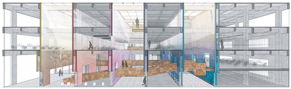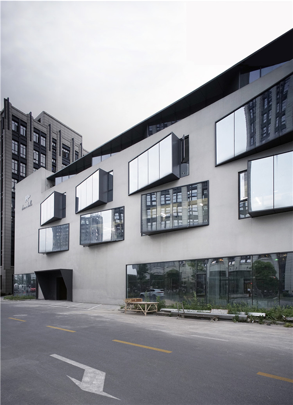 建筑的外立面采用了旋转突出原有墙体的大型落地窗,不仅为建筑外围空间提供了充足的采光,也试图打破原建筑过于厚重的体量感,给予其更活泼的建筑形象。