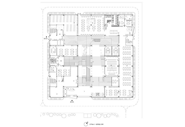该项目原有建筑是一个50米见方、曾用于绣花产品生产的厂房,建于2003年。传统的厂房空间、进深过大的平面形状、规则的柱网排布,导致室内采光不足,限制了空间的灵活利用。设计师通过挖掘原有建筑的使用潜力,打破原空间格局,重新规划分区,加入独特的新鲜元素,进而塑造出明亮、舒适、灵活多变的办公空间。