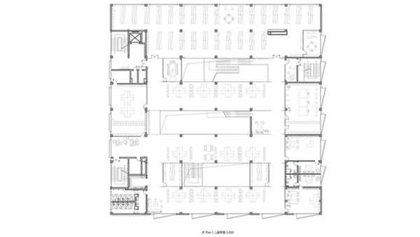 为解决采光不足的问题,设计师首先在室内空间中心区域置入了三个单柱跨的采光中庭,力图给原本硕大且密闭的空间带去相对充足的自然采光和新鲜空气,所有的核心开敞办公区域均沿中庭两侧的玻璃幕墙布置,间接进入的光线正好满足了办公所需要的光线照度。