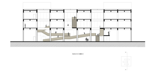 这个空间序列的进一步实现,是靠一个贯穿了整个厂房每一层空间的坡道、连廊与楼梯的体系来完成的,就像一个神经中枢穿越时空:它时而进入通高的中庭,时而进入狭小半私密的开敞空间,同时又连接着楼层之间的流线转换。这个建筑漫步式的体系不仅是交通的内核,更创造了一个丰富而富有身体节奏感的漫步秩序。与楼梯融为一体的连廊则弱化了固化的空间感,形成活跃的交通聚集空间,诱导人们通过这些路径在不同的空间内交流与互动,激发使用者的创造力和对空间探索的欲望。