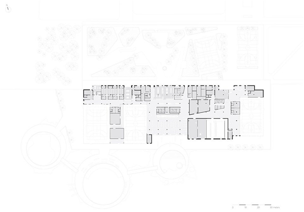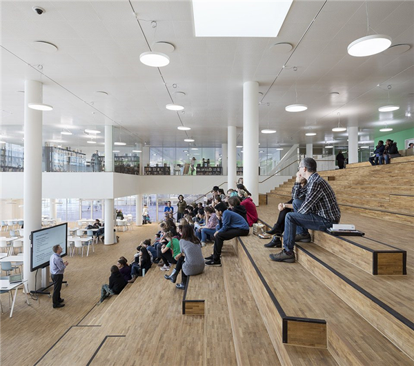 该校区的主要建筑被分割成四个略小的塔型建筑,这些塔型建筑高度被安排至5层到7层不等,来适应学生的不同需求。例如最小年龄学生的教室被安排在较大空间:该空间包括绿化,表演,体育活动等多种功能空间。这种校园分区规划形式令建筑内部区域更加明确,学生行动更加便捷。四座独立的建筑单元均以底层为公共连通空间,该区域包括各种体育活动设施,公共食堂,图书馆和表演场地,学生及教职工人员可以在此进行多种多样的室内及户外活动。因此教学区域可以保证与其他公共区域的隔离,同时又与其他户外活动互不影响。