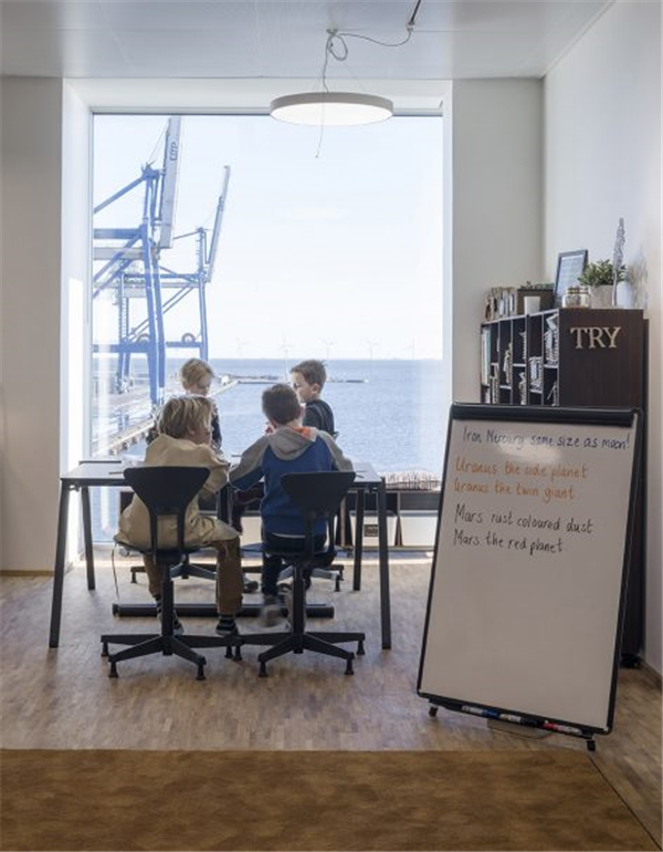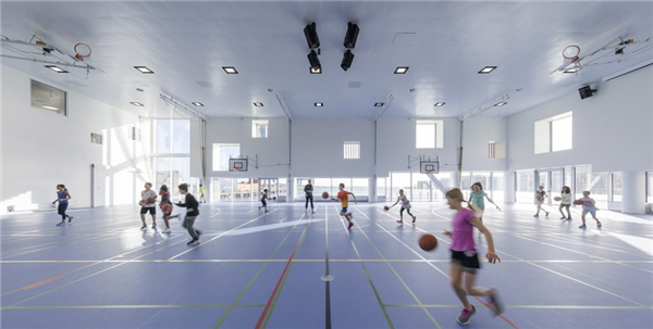 底层屋顶作为户外体育场,包含满足低领儿童玩耍的体育设施。该操场避免了学生过于接近海岸,保证了学生娱乐活动的安全。