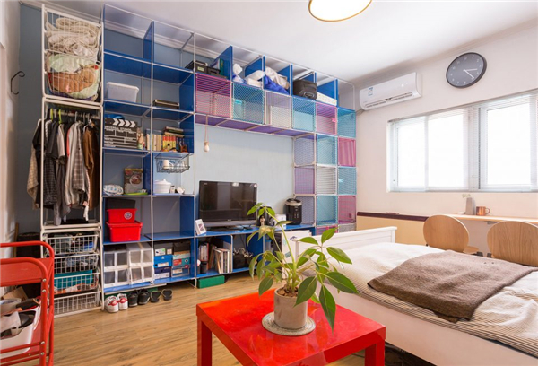 北京案例:集成了电视柜、衣柜、置物架,并内嵌一组猫笼的小户型物品收纳系统