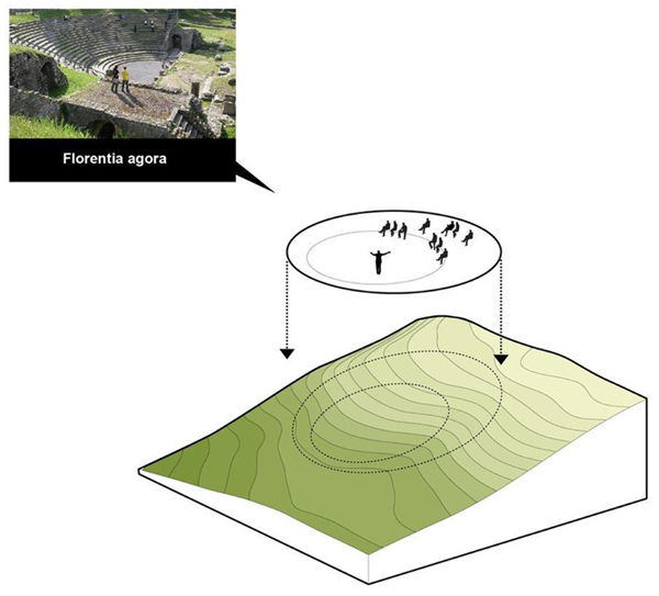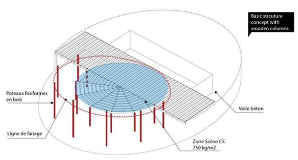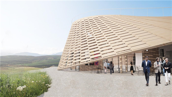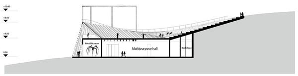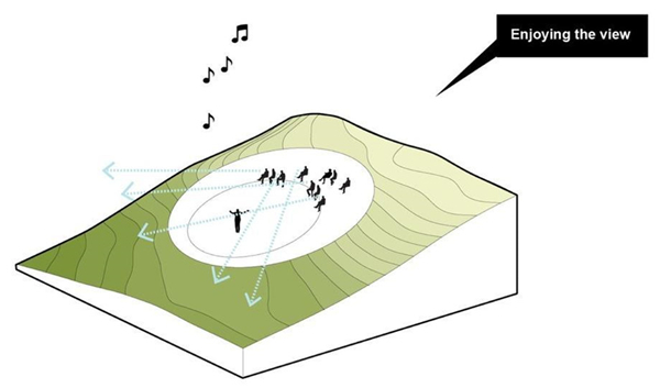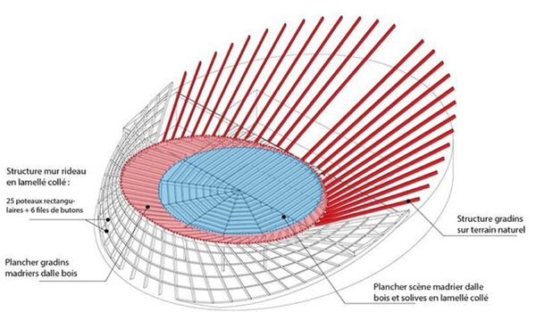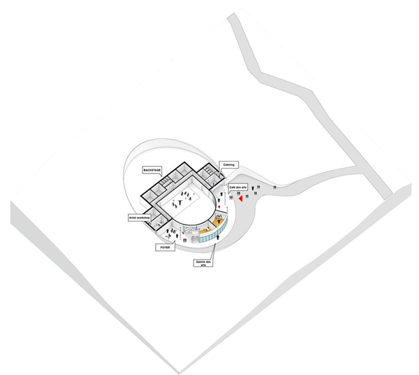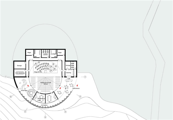 圆形剧场被嵌入在山坡的一侧,其设计方式参照了莫比乌斯环的原理,在建筑立面上使用了弧线元素。相比之下露天看台被设置在与山丘的弧线标高垂直相交的地方。