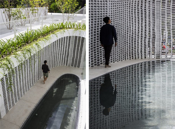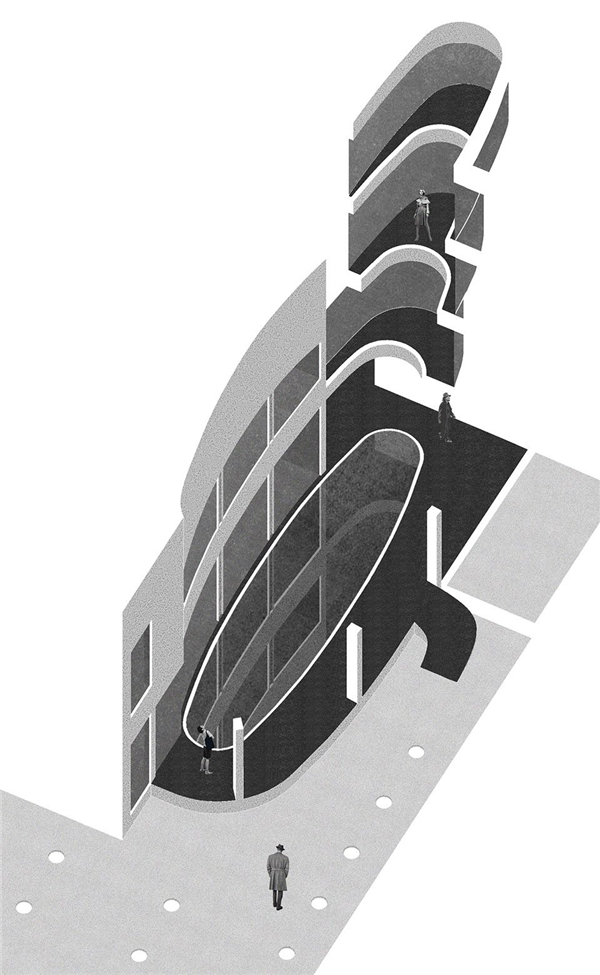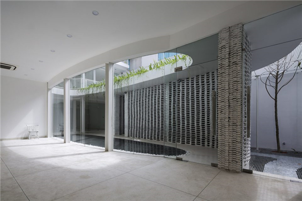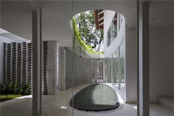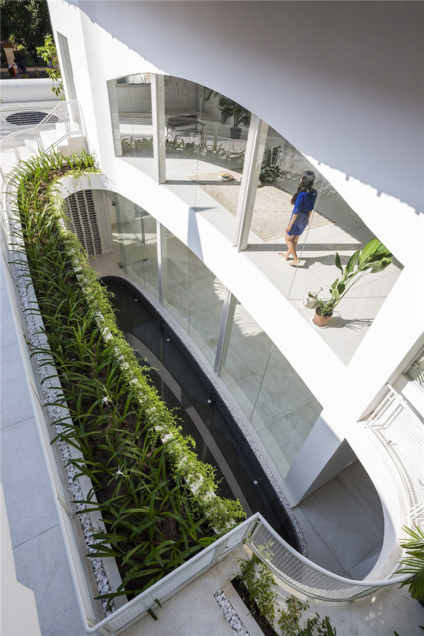 在面向嘈杂城市的一边,住宅向内凹陷形成内部空间来规避私人环境以外的纷扰。这种空间的减法操作,使住宅在城市中维持了诗意般的平和宁静,如同泥塘中的睡莲,安静注视着周围的一切。椭圆形的空间沿着住宅平面深入住宅内部,又顺着住宅的高度层层递减,形成可视化的抽象空间几何形态。