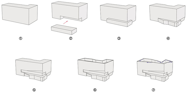 体块的确定我们还要找到一个秩序性元素作为我们的图底,在图底的秩序上来做画,那么切片元素,既每个个体的变化能做出硬朗的雕塑效果,也与周边层岩的山峦相应,作为我们的表皮容易建造发挥,在内部空间采光通透性上都比较实用。