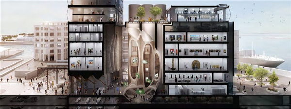 画廊和中庭空间成型于筒仓内部由42根管道构成的如蜂巢般密集结构之中。该项目包含总面积达6,000平方米的80个画廊空间、屋顶雕塑花园、艺术品储存和保护区、书店、餐厅、酒吧以及阅览室。博物馆还将设立多个以服装、摄影、策展、动态影像、行为实践和艺术教育等为中心的空间。