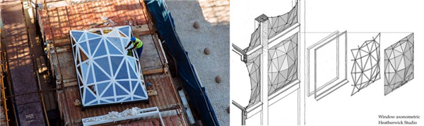 新的混凝土核心筒结构拥有420mm的厚度,并为旧筒仓的切割提供了依据。建筑师对既有的管道进行了修剪,使4600立方米的中庭呈现出弯曲的几何形态。切割的边缘被磨光并加上镜面,与建筑粗糙的混凝土整体形成对照。每一个弯曲的管道顶部皆装配了直径为6米的夹层玻璃,从而为中庭带来自然光照。余下的内部管道则被拆除,为80个画廊提供了6000平方米的展示空间。位于地下的隧道则被用于一些需要在特殊场地进行的艺术创作。