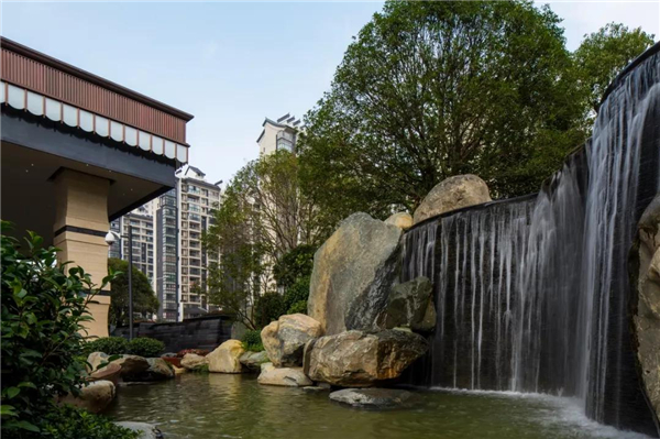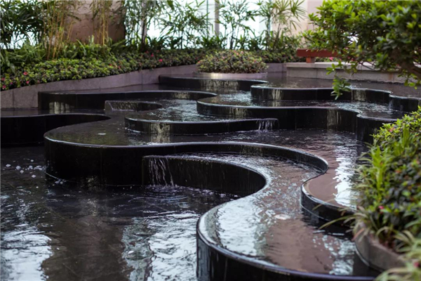 为排除周边喧闹街区和巨量人流的干扰,设计师运用山、水、石三种元素设计了流水景墙和地形起伏的叠山瀑布景观。对外表现为连续整体的景观展示面,对内是从人工到自然的多层次水系景观,在"溪谷"起到隔绝视线与噪音干扰作用的同时,使得酒店前场到达区的景观形象更为生动丰富。此处与59层云端花园的概念相对应,寓意溪谷。