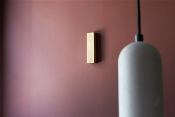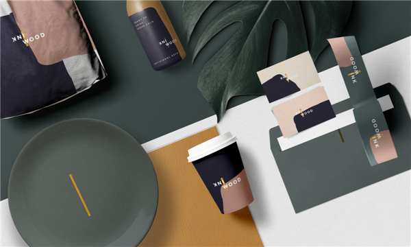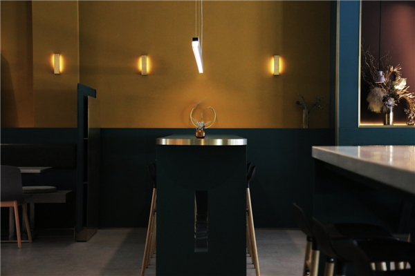 在INKWOOD,给很多人留下印象最深刻的是餐厅的用色。Andrea说,“木、墨和酱汁的色彩让我想到了意大利画家Giorgio Morandi的配色,我想要让INKWOOD的用餐者们感受到木与墨的浓重和温度,同时在视觉层面上‘品尝’到酱汁和食材在一起冲撞、对比和融合的味道。”在VI的平面设计中,墨的表现是灵动的,是一系列流动的色彩泡泡;而主logo则用一条简单而肯定的金黄色笔划,连接起互相镜像的“INK”和“WOOD”字样。同样的,在空间中,设计师并不想用太多的曲线来分散客人对食物的关注,因此在餐厅的空间设计中,木与墨的表现只剩下了色彩和材质的变化,地面、墙面、家具、转角、各种订制灯具中,凸出的是那笔金黄色的连接以及不同材质所表现出的精致细节。
