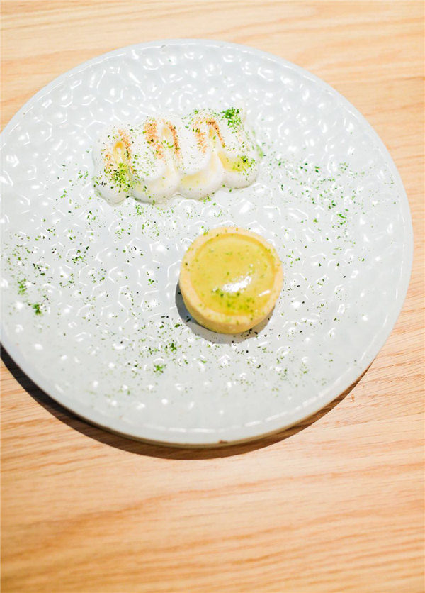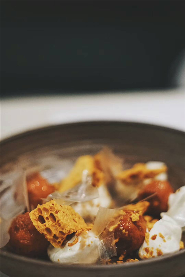 整个餐厅有各种不同的座位配置,适合不同的用餐人数的顾客,最值得一提的是厨房窗口前的“主厨的餐桌”。高桌的设计能让坐在这个桌子上的客人视平线与厨房内工作着的厨师们的视平线同高,透过窗口摆放的北川和合伙人最爱的烹饪书籍,可以观摩烹饪的全过程。餐厅的餐具、软装甚至花艺也延续了INKWOOD的VI配色和空间设计的整体风格,述说食物的层次和情感化学作用,如同北川的糖葫芦,解构的软糯山楂和焦香的蜂巢搭配一勺奶油撒上些糯米纸,是东西文化的交融,是北京童年的记忆,也是北川的缩影。