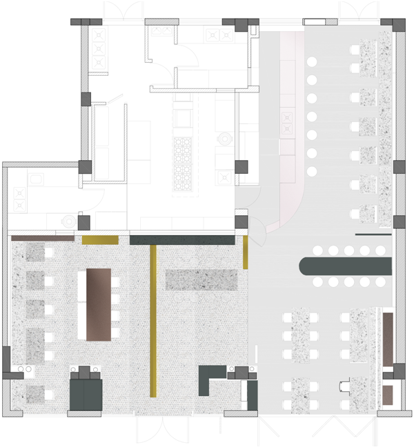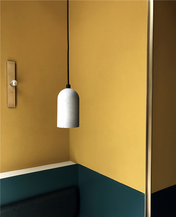 For many people, the first impression of INKWOOD Restaurant is the color combinations. Andrea says, “The colors of wood, ink and sauce remind me of the color scheme often used by Italian painter Giorgio Morandi. I want guests to feel the intensity and temperature of wood and ink, and to ‘taste’ the sauce and ingredients with their eyes first.” In the visual design, a series of flowing color bubbles are used to represent “INK”; while in the main logo, the mirrored writing of “INK” and “WOOD” are simply connected by a well-defined golden stroke. The designers didn't want to use too many curves in the space to distract customers' attention from food. Therefore, interesting color and material combinations are used in the space to express the concept of “INK” and “WOOD”, highlighting that stroke of symbiosis in the form of a brass stripe, which is on the floor, the wall, and the furniture, as well as in the custom-made light fixtures.