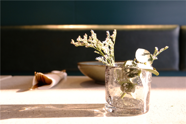 There is a variety of seatings that allow different groups of customers to find a space that suits them. One of the highlights is the “chef's table” across from the kitchen window. The high communal table allows guests to be at the same height as the chefs working in the kitchen, and to be able to observe the entire cooking process through the window, below which Beichuan and his partners placed their favorite cookbooks. The restaurant's cutlery, accessories and even flower arrangements continue the overall style of INKWOOD's visual design, like the chemistry created by food and sauce, delicate, warm and many-layered.