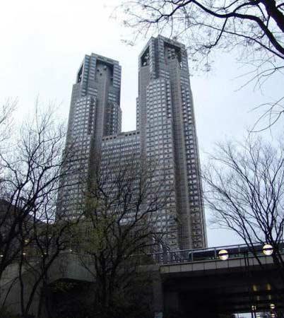 东京的东京都新市政厅拟建于新宿付都中心。总用地面积4.2公顷,总建筑面积要求37万平米,在设计条件中要求新的厅舍应该成为21世纪发展的东京自治和文化象征,国际城市东京的象征。丹下方案朝京亡广场旅馆方向布置了43M七层高的部分,围成一个半园形广场,靠近海亚特世纪旅馆方面布置了243M高的双塔作为第一厅舍,双塔总面宽108.8M,中间部分高150M,在日生大厦的南面布置的阶梯状的第二厅舍,34层163米高。在第一第二厅舍之间设置了中央林荫道,把厅舍的三个部公紧密的连接起来,并与厅舍南面的新宿中央公园二大片绿化连成一体,建 筑立面是深浅花岗岩与反射玻璃的组合。建筑主体结构和外装修寿命以100年以上,至200年考虑。内部装修及设施以5-20年考虑更新。