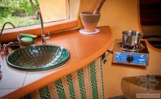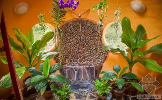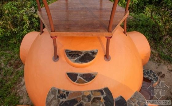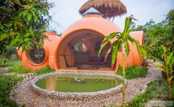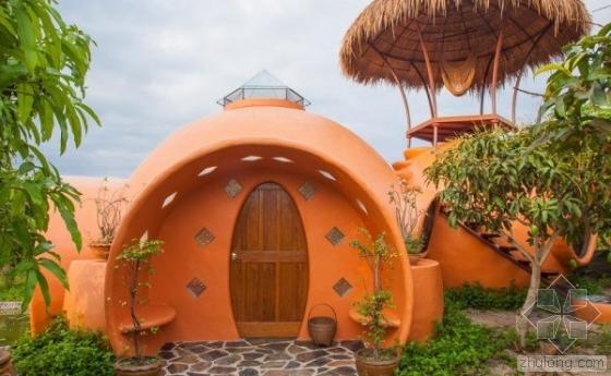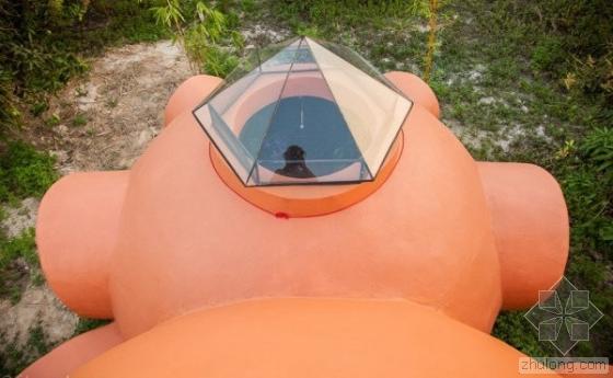 以圆顶为概念设计的房子配上亮眼的橘色,在这绿意盎然的园子里显得十分醒目。屋顶的玻璃通风设计与一般的烟囱不同,三角造型就像是法国罗浮宫的玻璃金字塔的迷你版一样。卧室上方搭建的小亭子使用充满浓浓东南亚风情的茅草作为屋顶,坐在上面让人能远眺整片香蕉园,心情顿时开朗,烦恼通通都抛到九霄云外去了。