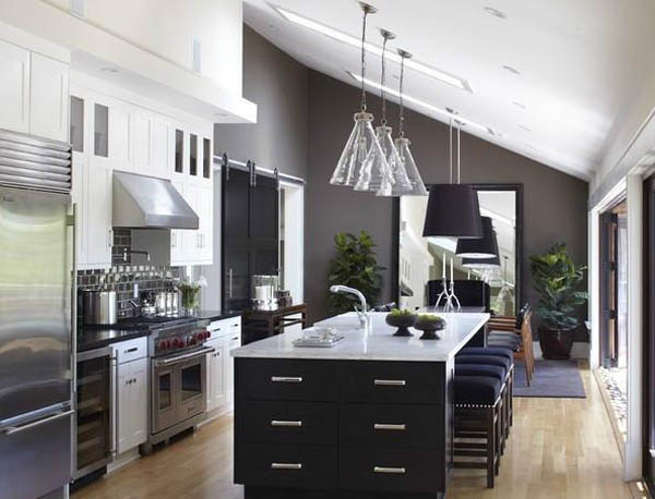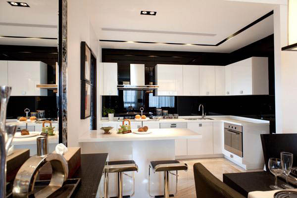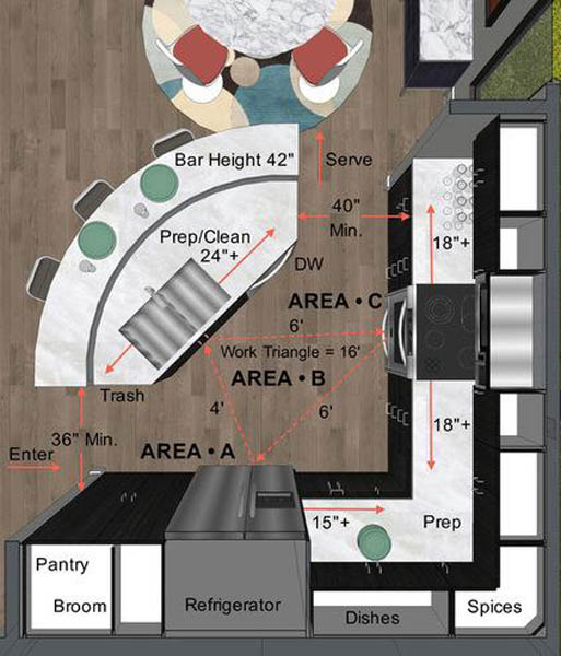 烹饪区应该面向餐厅,两者之间可以设计一个水槽。灶台、餐桌和水槽放置呈三角形,我们可以称之为“工作铁三角”。