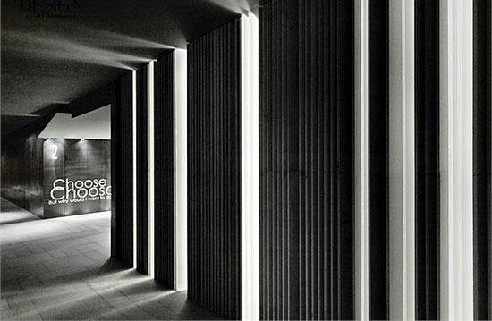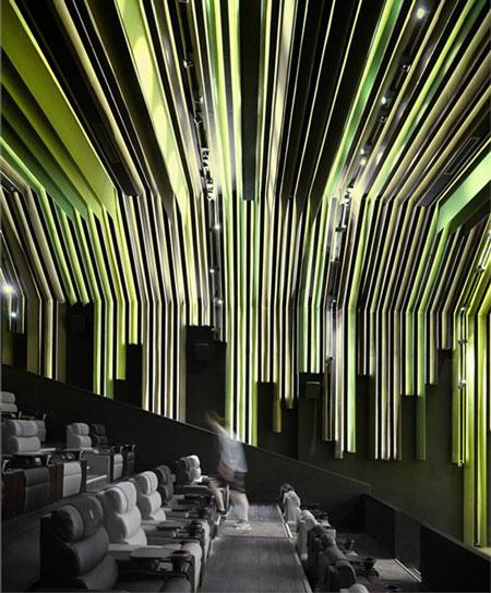 踏进电影院,迎面而来是纯白色的购票大堂,举目四望,全部都是一片片折叠起来的书页,稍一不慎,就堕进这个无底的书海。座落在正中央有几排整齐的书页,远看几可乱真,这由人造石堆砌而成的售票处。当你沿着黑色的走廊前行,径自来到等候室,就会看见两条高高耸立的云石柱,云石柱上的纹理看上去像栩栩如生的书脊,安稳地屹立于这片书海之中,没有丝毫的不协调,恰如其分地发挥着作用。头顶上则是无数支纵横交错的长身绿色灯,打破了纯白色的格局,增添一丝大自然之感。书由纸生,而纸正来自活了千百年的树木,这些绿色灯就如从树干上延伸出来的树枝,为了争取最接近阳光的有利位置,大家都各不相让,尽最大的努力突出求生。