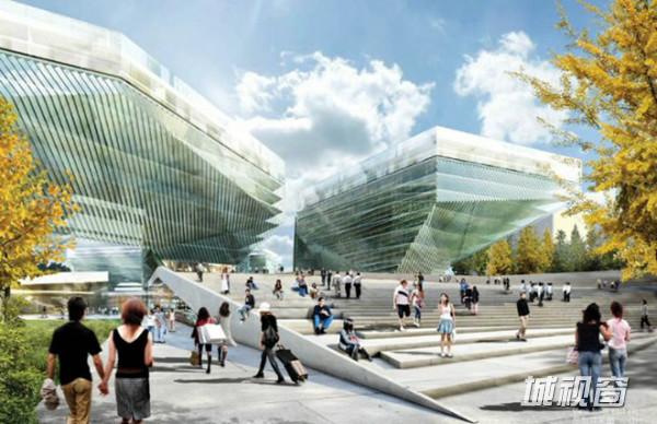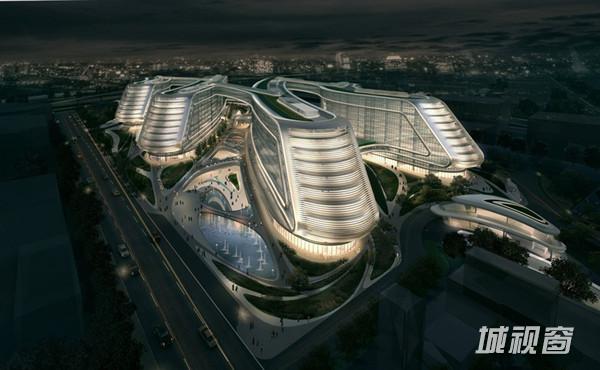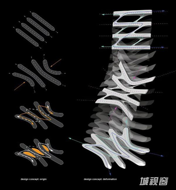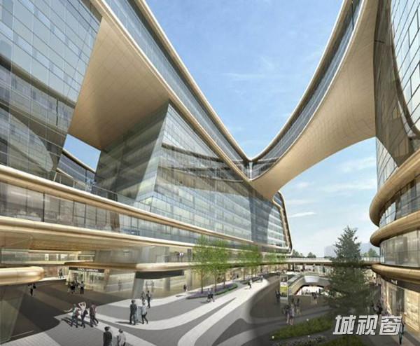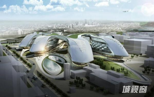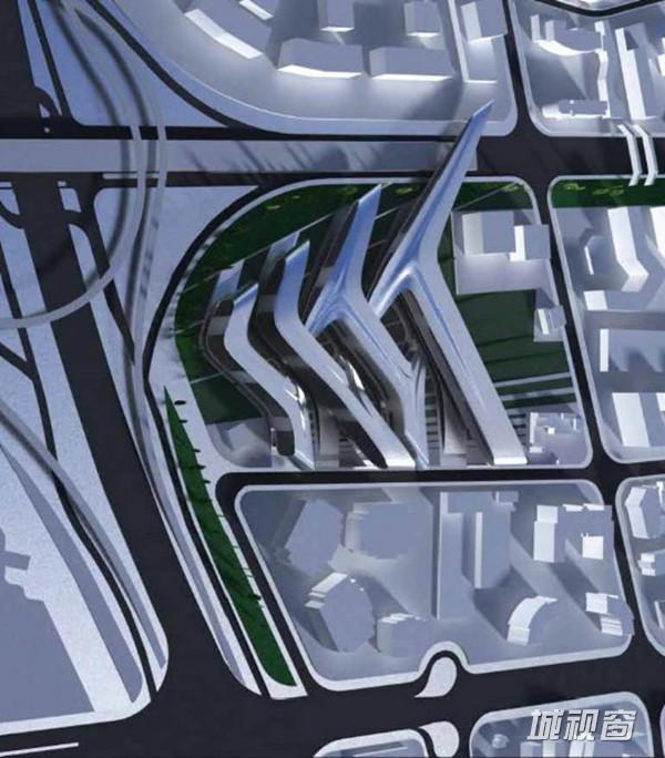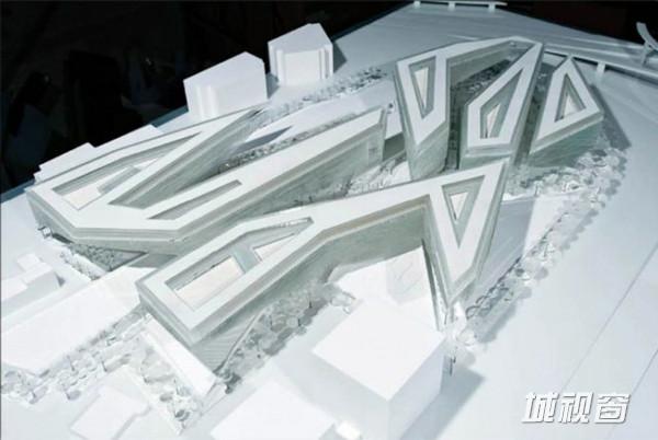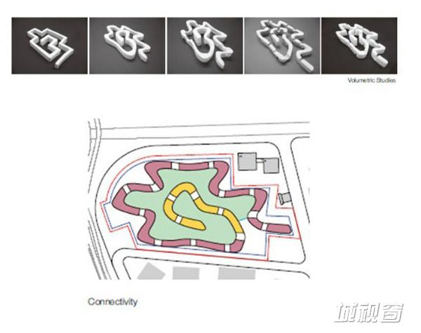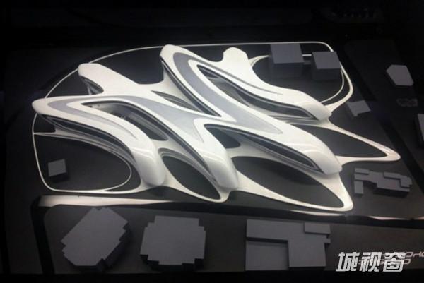 扎哈的中期方案借鉴了中国传统“结”的概念,在基地上呈现了互相联结的四条办公楼。