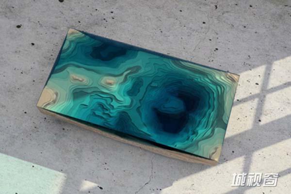 伦敦达菲设计工作室通过叠放层层玻璃和木片,制作出了“深渊桌面”,真实再现了蔚蓝大海的深邃美景。整张桌子就像一张3D地形图,从地质学的角度展示了海洋的横截面。“我在玻璃厂商那看到了层叠在一起的厚玻璃,注意到随着层数的增加,它们就像深海一样,展现出的颜色效果也会越来越深”,设计师克里斯多夫说到:“我希望用这种效果复制真实的海床景色,就像神话中的人物用神力将一块长方形的地表连水体一起升起,用作他的私人书桌那样。”这件延续伦敦达菲设计工作室传统美学家具,不仅美观而且实用。