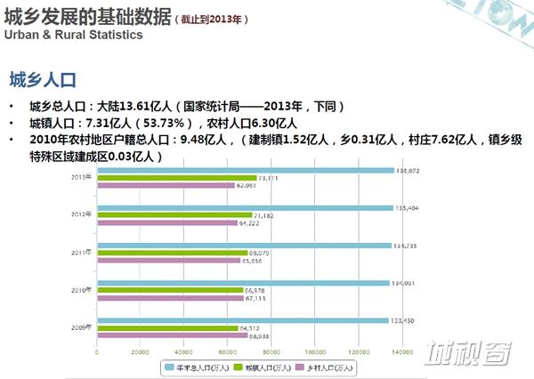 今天讲的是新型城镇化和度假旅游地产这两个话题城市化已经过半了,这是过去五年城市人口数字,当然统计跟实际的情况还是有出入,这是官方的数字,城镇人口已经达到了7.31亿,农村人口是6.30亿这么一个尺度,城区面积18.34万平方公里,从总量上看似乎基本守恒,但是大家都知道土地的位置和质量都在严重的下降。