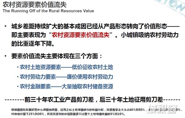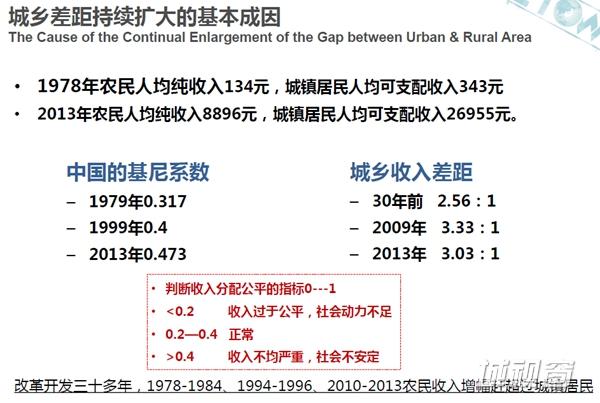 中国的基尼系数在官方公布的数值已经是零点四几,但实际上民间研究已经超过零点六了,大于零点四就是收入不均已经非常严重了,社会有些不安定因素,实际上我们增了,城镇化的本质是公共资源,财政资源和公共服务,向农村流动达到城乡平衡的过程,但实际上反过来的现状是不平衡,所以现在农村的问题就在于,农村和小城镇没有地位没有政策没有资金,没有特点甚至没有发展的思路。
