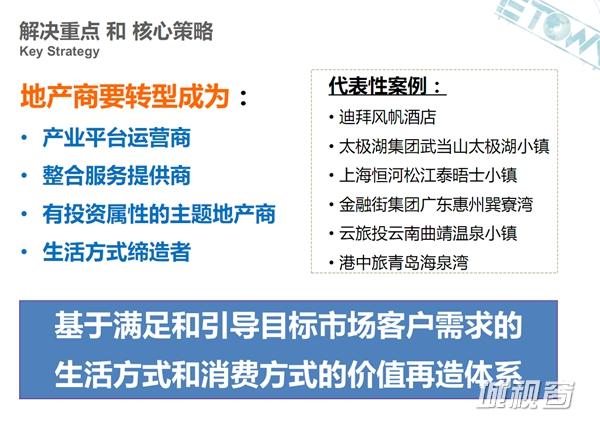想要做旅游地产的地产商必须要做几个转型,它不是简单的快速的快餐式的,这一块经常会给地产商朋友几个建议,就是你要做到四件事:成为产业平台的运营商;整合服务的提供商;有投资属性的主题地产商以及生活方式的缔造者。每一块里面都有一些含义,所以做旅游地产是在干什么实际上是在干基于满足和引导目标市场客户需求的生活方式和消费方式的价值再造体系,就是你给他提供的是一种体验和生活方式,所以我们希望能够通过一个统筹的一体化的方式,这样的话我们就不是一个简单的说,给我们的开发商朋友做点图,写点报告这么简单的一个技术服务,而是成为他的事业的一个全方位的合作伙伴。