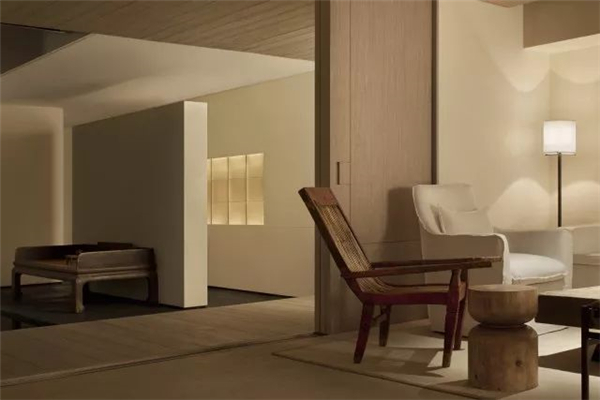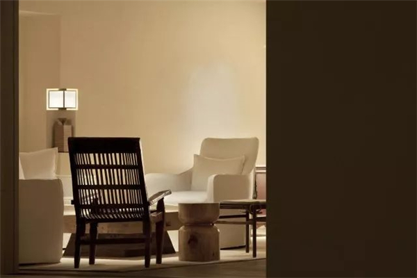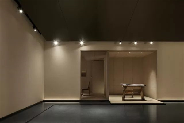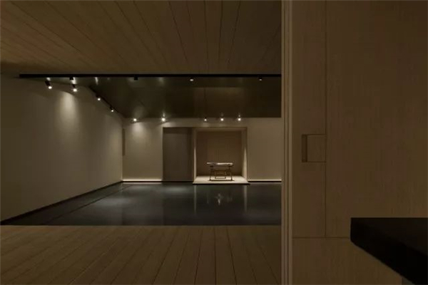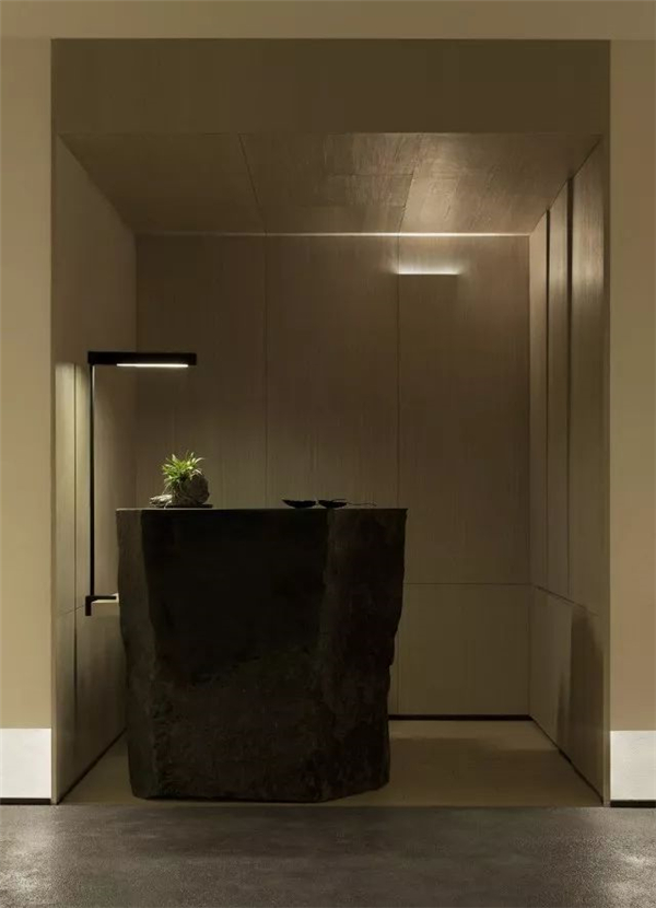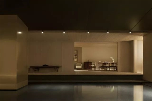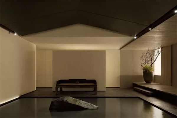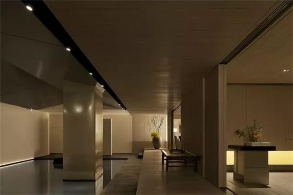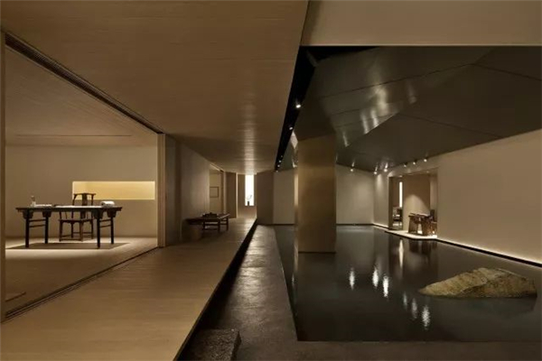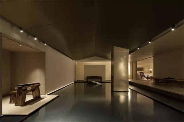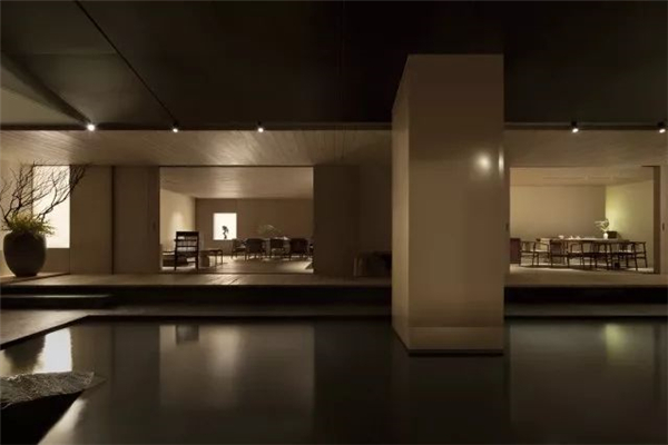 天花上几乎没有光,我的本意是尽量去解放了光,在墙角、墙上、墙面,以点、线、面的模式搭建成了整个空间的光的语言,水内的倒影再以低几个亮度的光线去补充,这样便随着整体的明暗关系生成了想要的空间意境。视线是不用向上的,人本身就不会老仰着头往上看,一来刺眼,二来总会有躲不开的阴影,现在这样更自然。光源本身就应该是空间装饰的一部分,人影绰绰,轮廓清晰,甚是美丽。其实这样设计的原因还在于此地的基本条件——没有任何的窗。没有天光的环境其实本身是有点压抑的,但借着人为的这般“水月”意象,空间的自然观感被带了出来,变得能待且能待得住了。