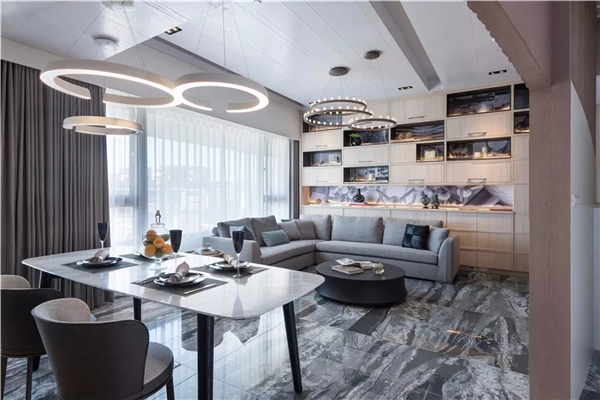对比墙体的动态变化,地坪则铺设较为稳重的石纹磁砖,衔接深色软件以及晶莹的环形灯饰,提示情感交流的场域功能。柔亮的日光映照入室,显现脱去赘饰的天花板与机能柜体,以包梁挑高及半开放设计共构开阔情景。近身观察,两侧柜体借由清玻和镂空设计,破解立面阻断视线的干扰;由旧电视墙改造而来的沙发壁柜,隐约透露浓淡笔画映衬地坪纹理,更加深家居的细腻层次。