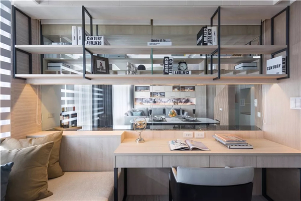 向深处行去,公领域的清爽语汇透过玻璃绵延进入书房,满室以清浅木质搭佐同色软件,为阅读时刻铺垫柔和氛围。两面开窗导引光线大方入室,映亮居室亦点亮思路;延著简约天幕而下,少许铁件俐落搭出层架,桌椅则延续相同工法形塑出强烈的一体感,为从事贸易的屋主提供松懈思绪的所在。随着户外光影变化,自在调整卷帘开阖尺度;夜深倦读时,也能悄声推开暗门直往卧室。设计师将体贴使用者的心化为这扇门,恰到好处地于动线中开启,成为及早入眠的温柔提醒。