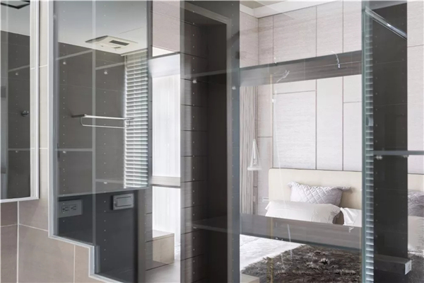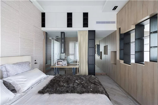 脚步来到色泽舒眠的主卧室,主墙舍去华丽装饰,以简单木质呼应地坪及墙壁纹理,构成横、斜、纵的隐约对话;特殊的三面采光,将大量光线倾倒于内,成为白日源源不绝的天然照明;并为满足隐私需求,搭配窗帘围塑出独立感受。墙面的镂空柜体巧妙运用玻璃背板,达成展示及引光功能,错落造型有效地带入浴室光线,展现设计师层出不穷的绝妙巧思!