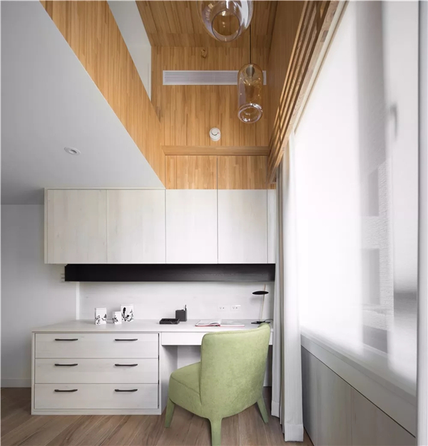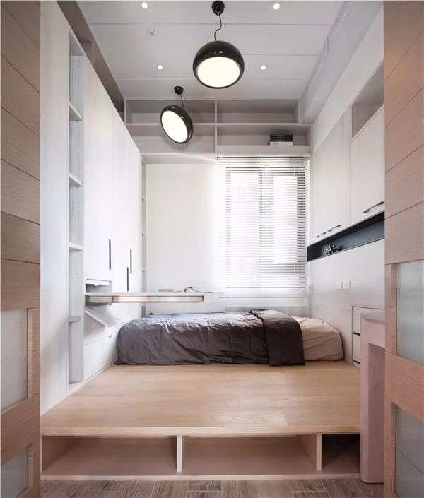 随着高度缓降,公领域的飞扬精神平息下来,廊道收纳凌乱的生活线路,连接主卧室与对面的两间次卧房;而后者又再以暗门连接,与书卧房对应,形成主要行走路径之外,串连私领域的秘密路线。大女儿房以木作门片隔间,并利用高度优势特别隔出夹层,划分出醒睡之间的细部功能;配合平日收纳乐器、线材的需要,设置大量柜体、层架使收纳便利同时保持窗明几净的印象。小女儿房则裁划为加高和室增加储物空间,齐顶的置物柜满足收藏用途;拉出暗藏其中的拉伸台面,为原先以睡眠为主的私领域添入多种使用可能,完成休憩、阅读、放松一体的独享天地。