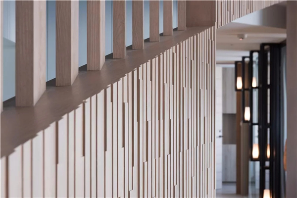 初踏入起居空间,斜向攀升的木质墙景随即攫取目光,下方细密层叠与上方格栅俐落分割,巧妙将玄关和客厅收整为一体两面,也带动视觉延展至廊道底端;运用弯曲弧线化解墙角的呆板线条,其下自然敞开的门洞则成为煮食区入口,开启烹饪聚餐的场所机能。