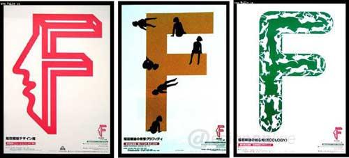 福田繁雄《F》海报系列,主画面为福田名字的首字母"F",对该字母进行变化。该系列又不同于"贝多芬"系列中以发部轮廓为基本形态,在其轮廓内部根据主题内容进行图形元素的置换,而是以"F"为基本型,作者对其以往在众多平面作品中惯用的图形符号或表现方式进行的重现。如矛盾空间、图底反转等错视原理和手法的运用,坐着的女孩和奔跑着的动物形象的运用等。使其作品打上福田的符号,成为其异质同构中的又一代表性作品。