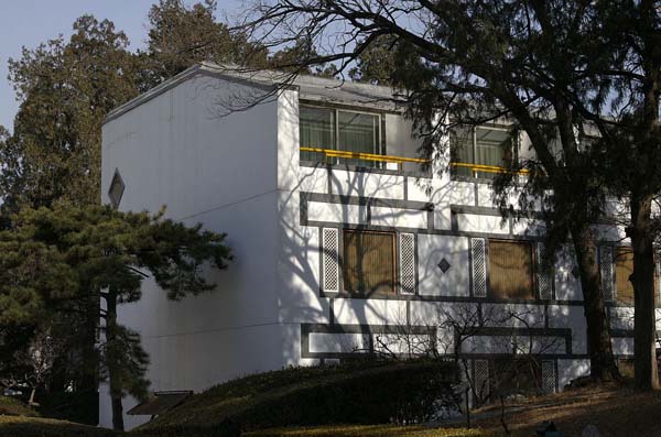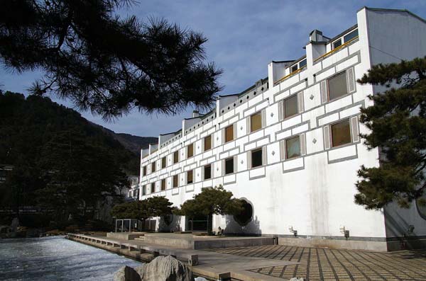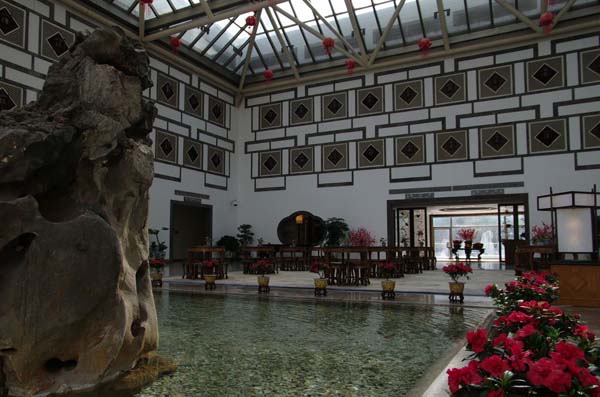 从平面布局上来看, 对中轴线这一几乎是传统生命力的东西,贝聿铭理所当然的加以利用,事实上这条轴线从入口处的广场就已开始,穿过入口,中庭中低主要庭院中在原址上重建的“曲水流觞”但贝聿铭较多的是受到江南地带的影响,面不学北京拘谨的四合院,他结合山中的古树保护,相对自由地安排建筑。因而形成了现在这种格局,规整中略带轻巧,而且并未忘记“大屋顶间的空间——庭院”这一基本元素的重复运用,大量的室外庭外庭组织成了他对历史传统的理解. 后花园内远山近水、叠石小径、高树铺草布置得非常得体,既有江南园林精巧的特点,又有北方园林开阔的空间。前庭和后院虽然在空间上是绝然隔开的,但由于中间设有“常春四合院”,那里的水池、假山和青竹,使前庭后院具有连续性。