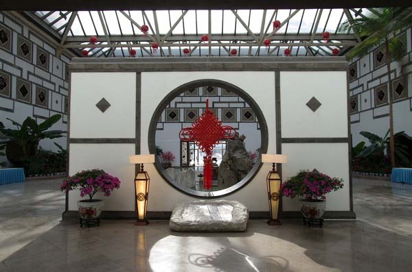家具陈设在建筑中用的比较简单除了中庭当中设有几个休闲式的小茶桌及藤椅之外,大都是一些简单的沙发及及茶桌,也都是方形和圆形设计,造型简单朴实,色彩无华,正如贝聿铭所说,不追求复杂的造型及绚丽堂皇的色彩,就借鉴江南民居白墙灰瓦的建筑形势,追求一种朴实,又包含中国文化。