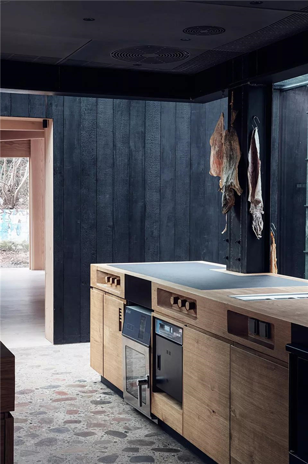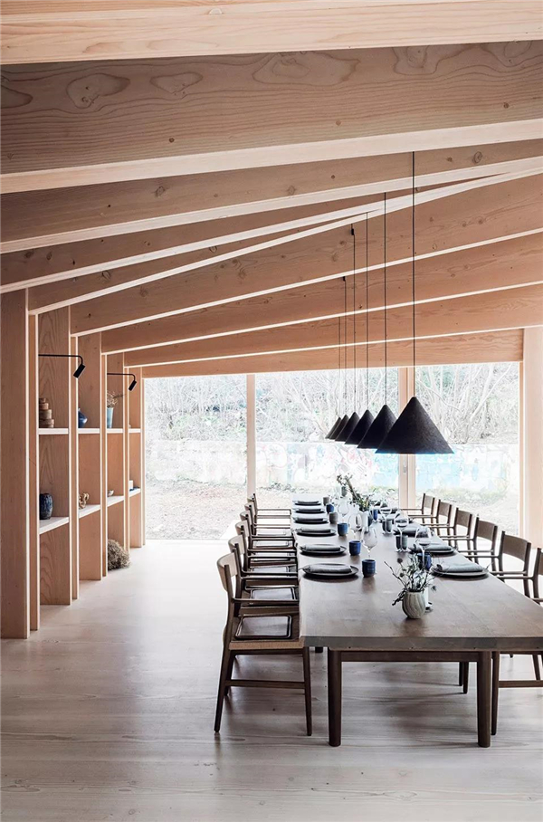 墙面上的架子摆放着Noma的美食档案,一台由设计师委托Brdr. Krüger公司定制的六米长桌装点了这个空间。该长桌来自于菲英岛上的一棵160年龄古树。设计师用Dinesen Douglas松木装饰并覆盖建筑梁结构。定制橱柜来自于橱柜制造商Malte Gormsen。灯罩设计由艺术家Jonas Edward选用当地海草设计并打造。室内设计师选用与艺术家工作室类似的灯具作为空间照明装饰。