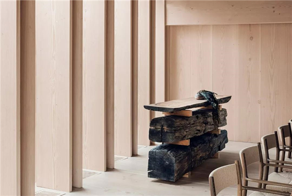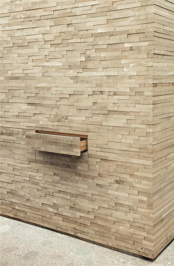 室内地板及墙壁由Dinesen橡木板打造,木板接合处由蝴蝶榫固定。用250,000颗隐形螺丝固定堆放的木板,作为装饰布置在墙壁一侧。位于中心处的柜台由来自海港的,拥有200年历史的木梁打造。用餐空间被刻意简化,营造出充满故事性的空间氛围。